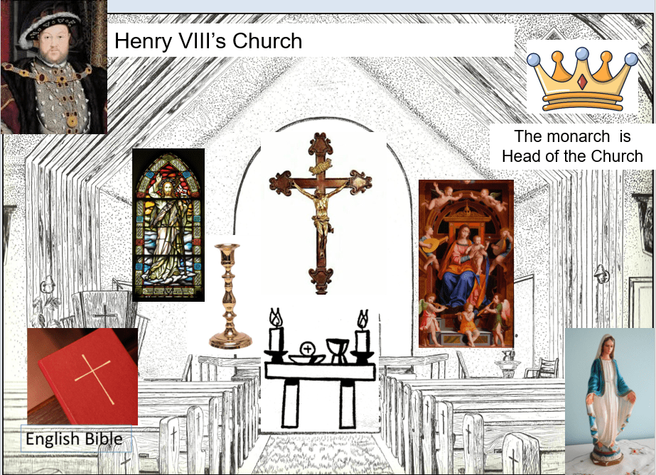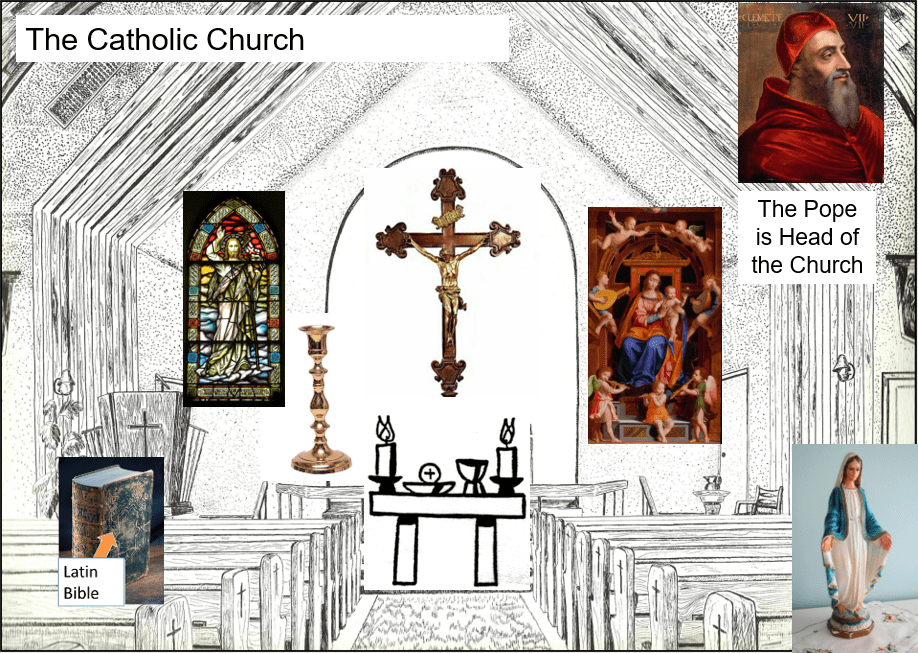 We have now seen what both Henry VIII and Edward VI did to the churches in England. Have a look at what the churches would have looked like for the three types of churches below.