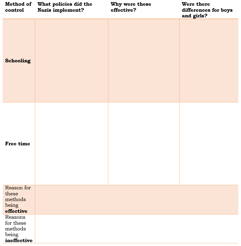 Read the information below on how the Nazis controlled young people in Germany. Complete the following table as you look through the information: