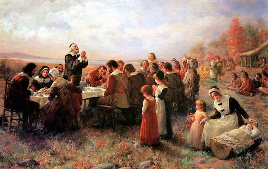 SOURCE E: A painting from 1912 showing a Thanksgiving meal between the colonists of Plymouth in 1620 on the coast of America. Notice the native Americans are also sat at the table.